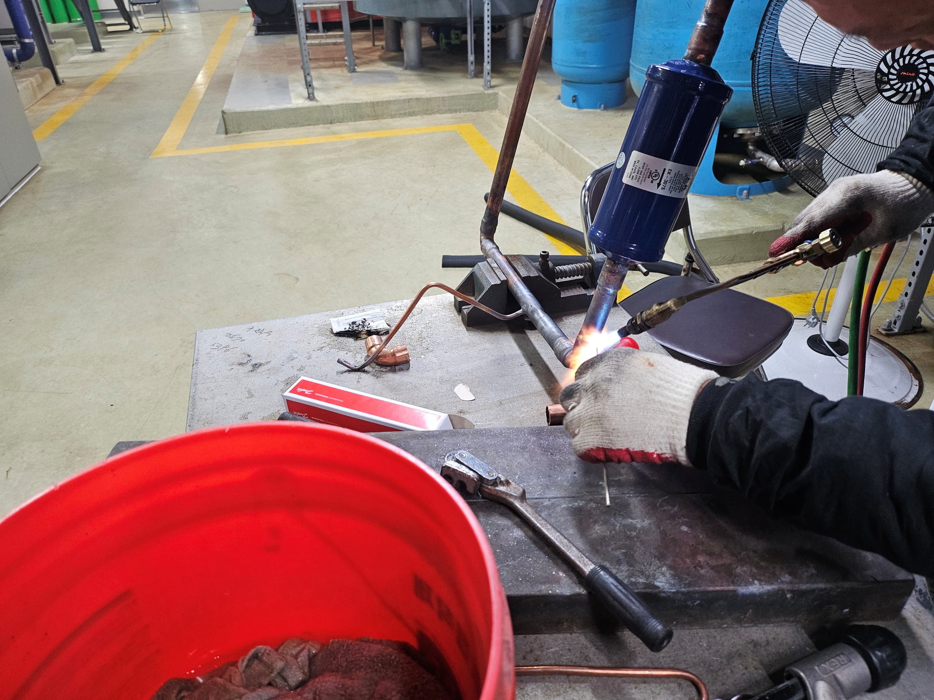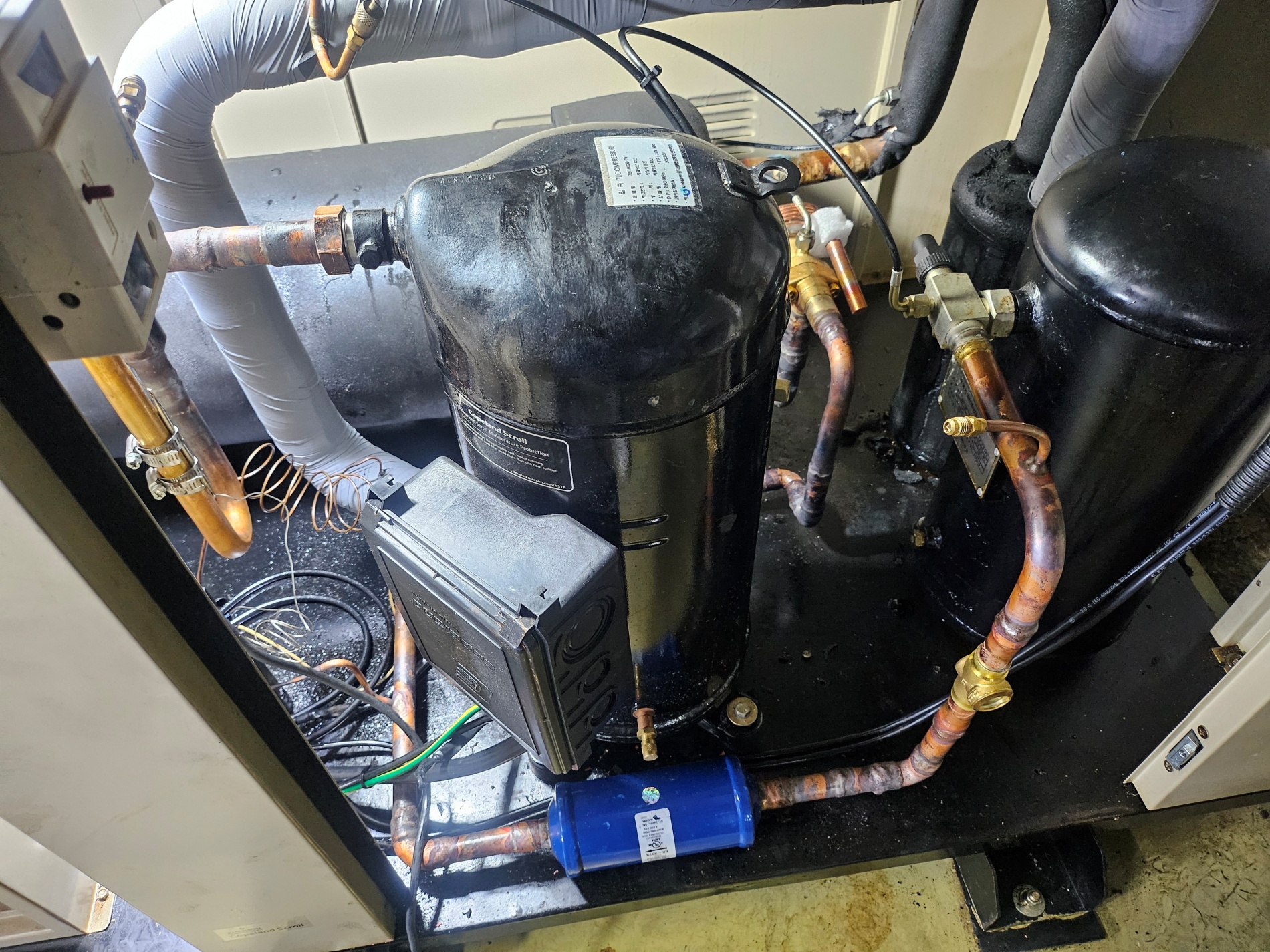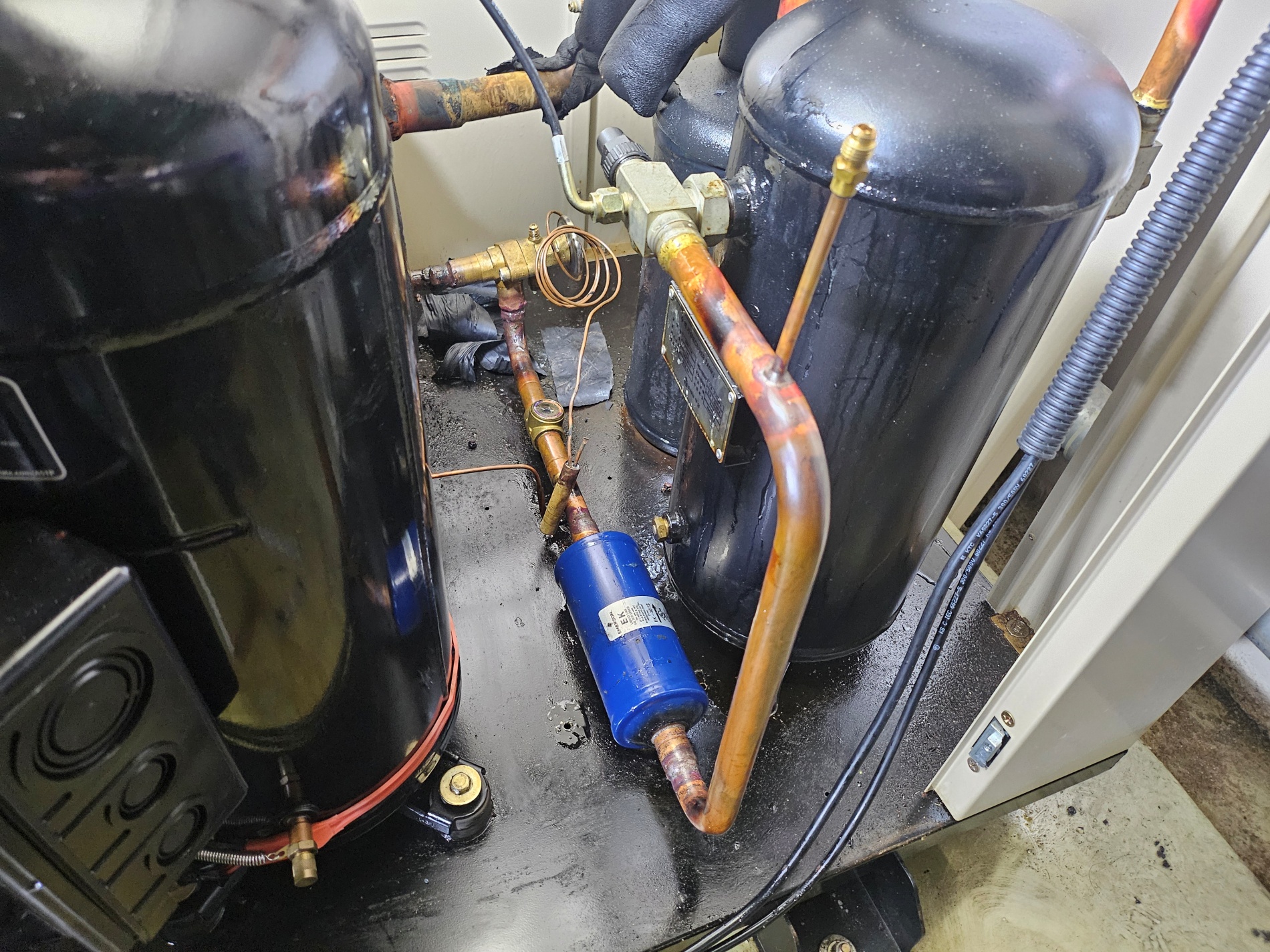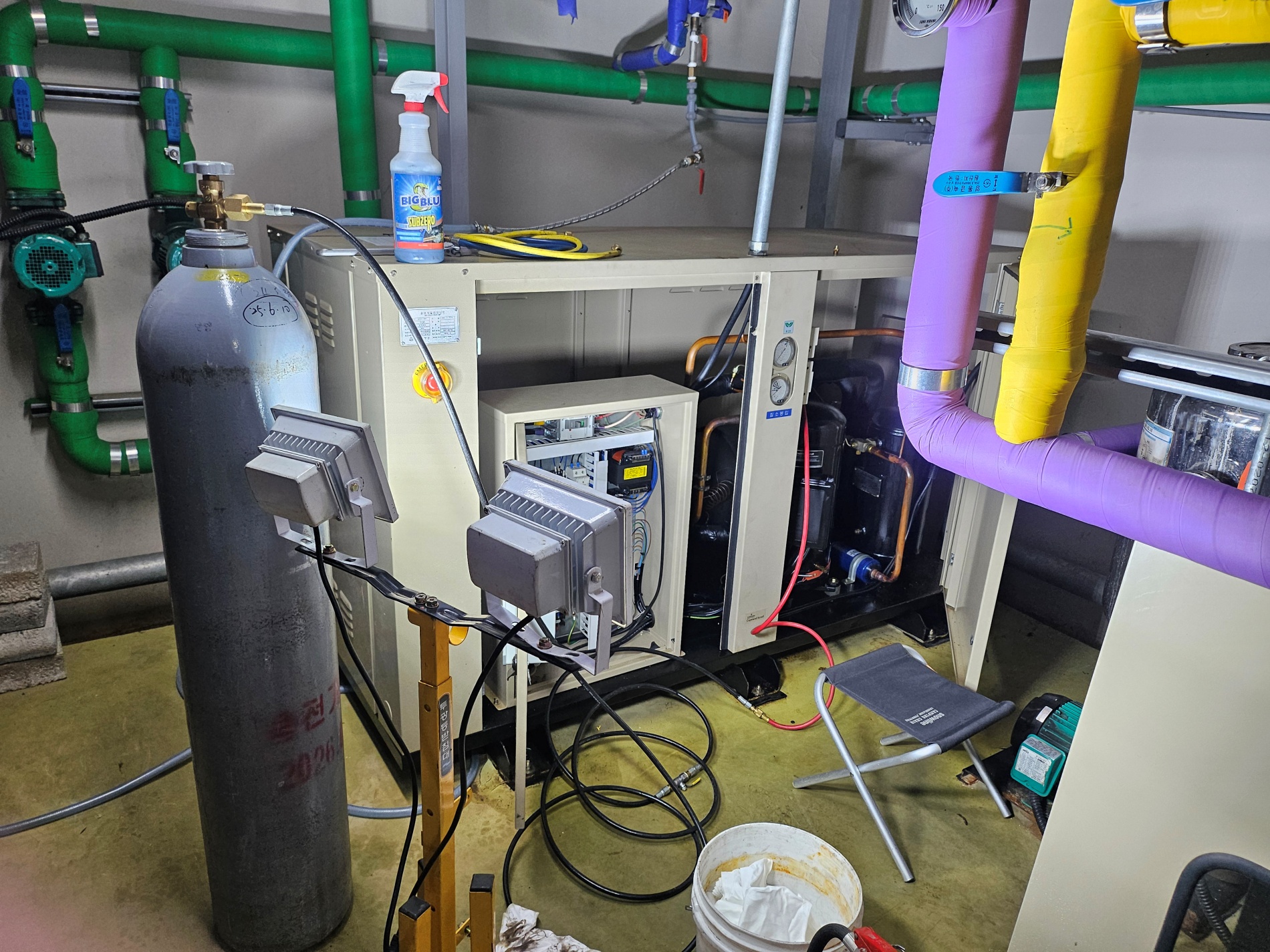 사우나,목욕탕 칠러냉각기,냉매누설작업,냉매누설탐지기,콤프(20마력)교체작업,사이드글라스,팽창밸브,필터드라이어,교체작업 시공사례