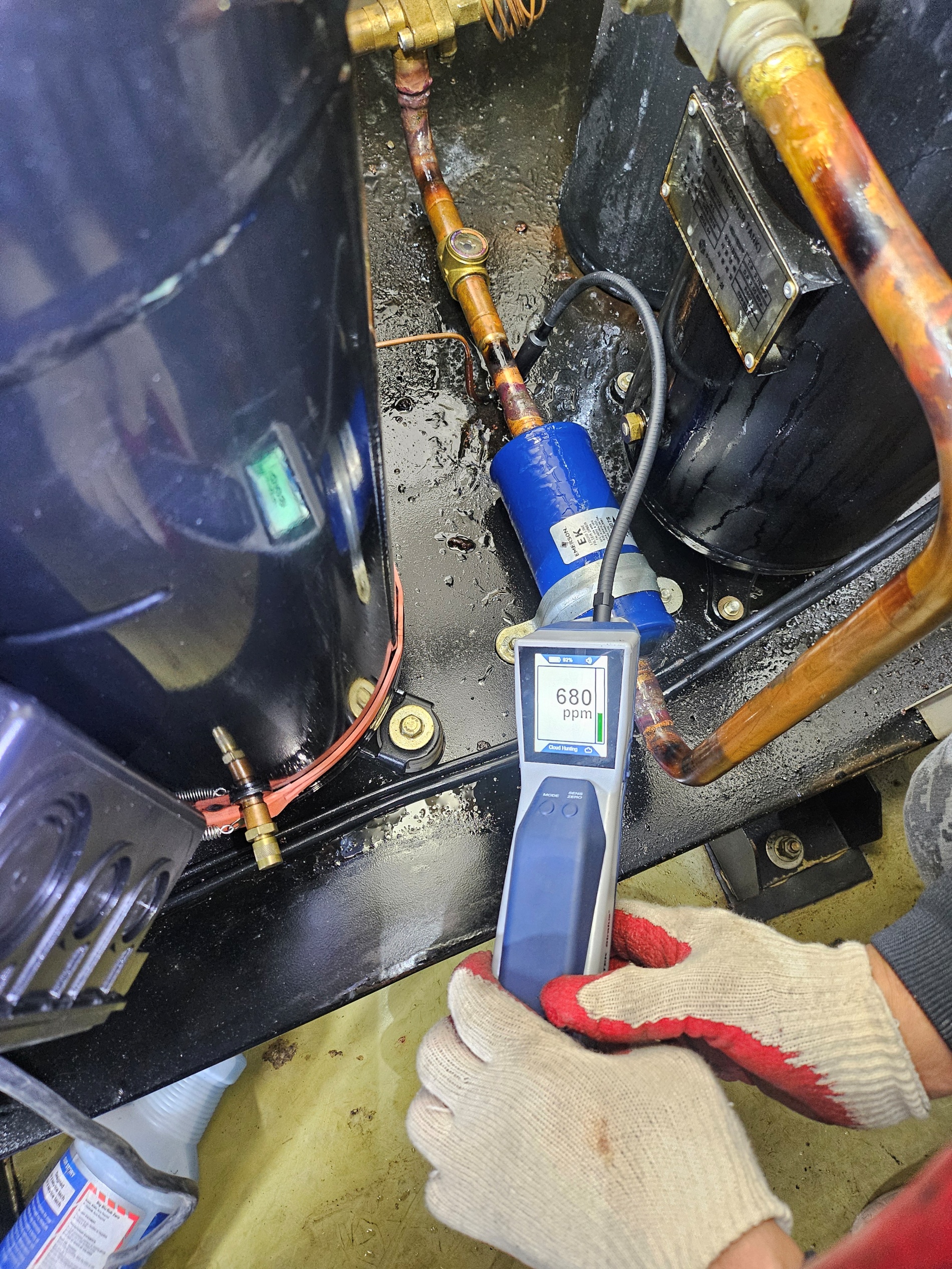 사우나,목욕탕 칠러냉각기,냉매누설작업,냉매누설탐지기,콤프(20마력)교체작업,사이드글라스,팽창밸브,필터드라이어,교체작업 시공사례